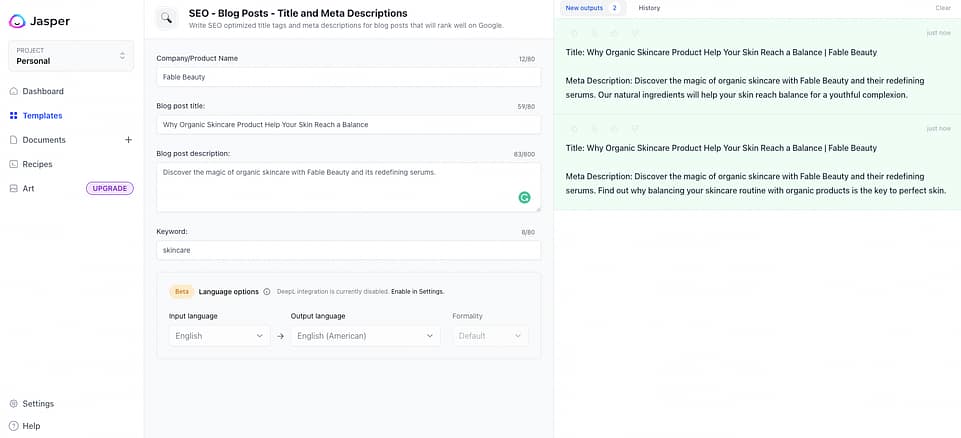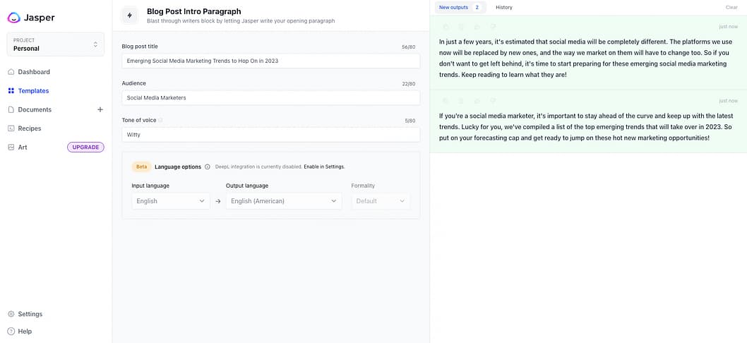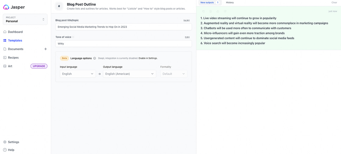 By providing the AI with guidelines like keywords, social media content, and your audience, Jasper.AI can help you generate social media descriptions and captions, email marketing outlines, SEO meta descriptions, website copy, and even blogs.