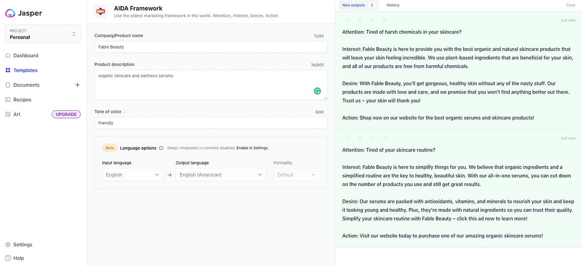 With over 50 templates, Jasper.AI provides you with a wide range of content ideas for free. Simply fill out the inputs, hit generate, and receive an array of content ideas related to your inputted topic.